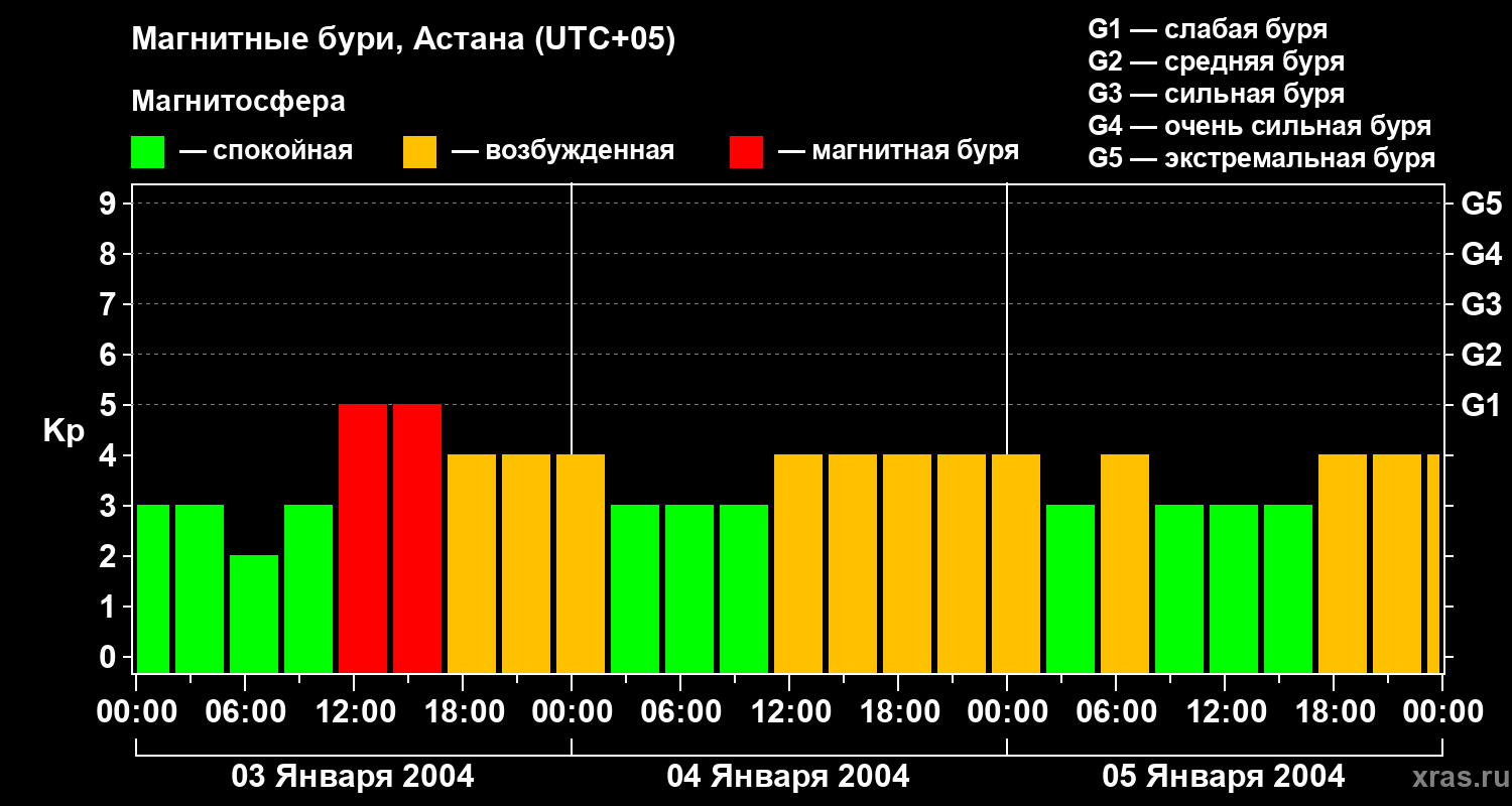 Изменения геомагнитного индекса Kp с 3 по 5 января 2004 года для средних широт