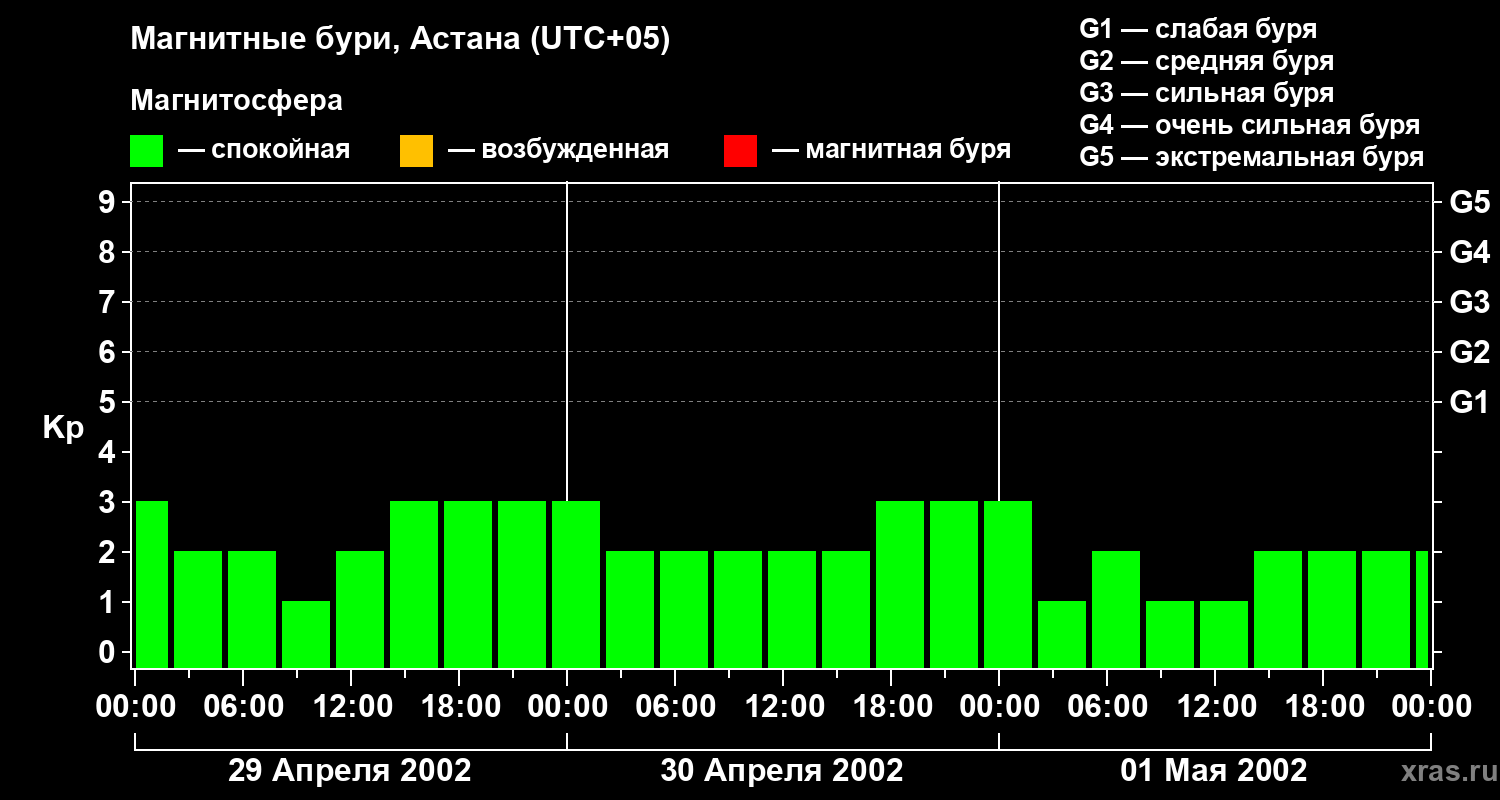 Изменения геомагнитного индекса Kp с 29 апреля по 1 мая 2002 года для средних широт