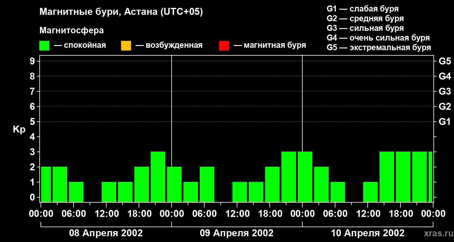 Изменения геомагнитного индекса Kp с 8 по 10 апреля 2002 года для средних широт