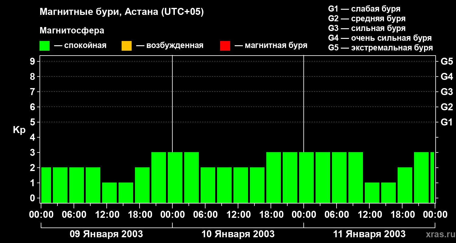 Изменения геомагнитного индекса Kp с 9 по 11 января 2003 года для средних широт