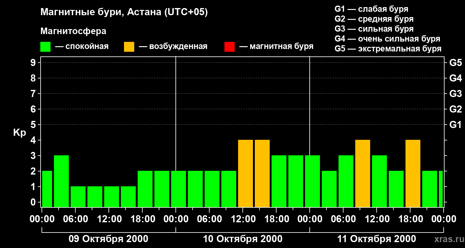 Изменения геомагнитного индекса Kp с 9 по 11 октября 2000 года для средних широт