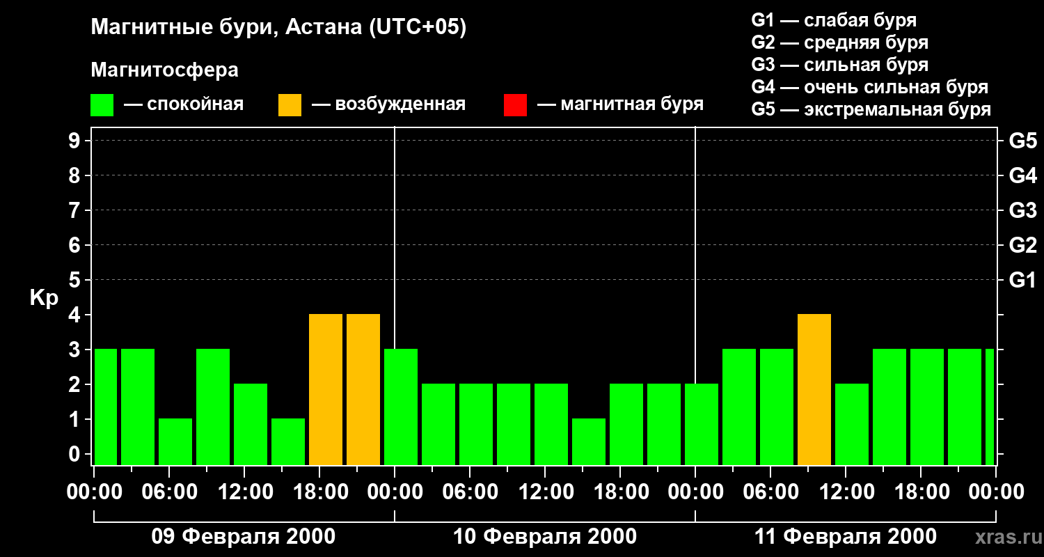 Изменения геомагнитного индекса Kp с 9 по 11 февраля 2000 года для средних широт