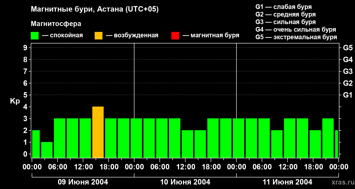 Изменения геомагнитного индекса Kp с 9 по 11 июня 2004 года для средних широт