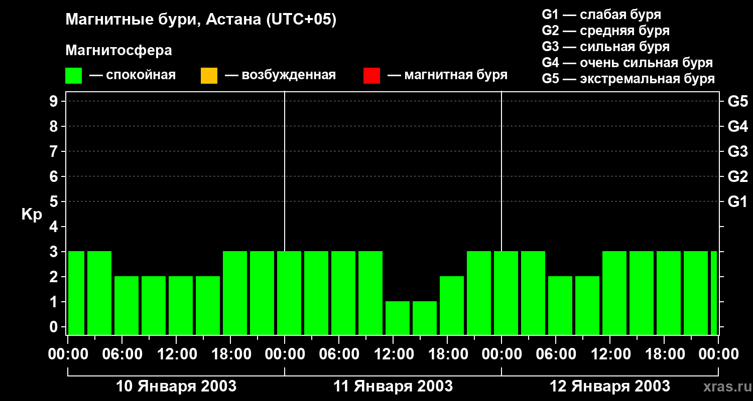 Изменения геомагнитного индекса Kp с 10 по 12 января 2003 года для средних широт