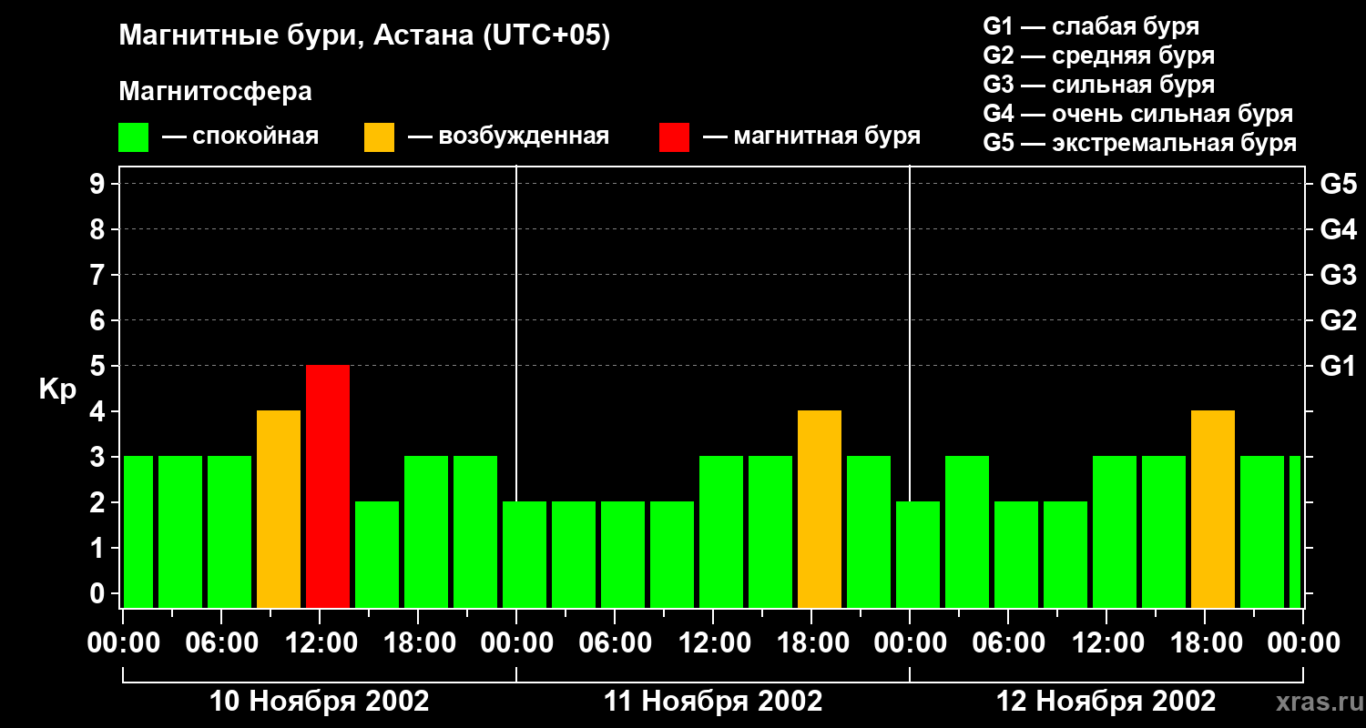 Изменения геомагнитного индекса Kp с 10 по 12 ноября 2002 года для средних широт