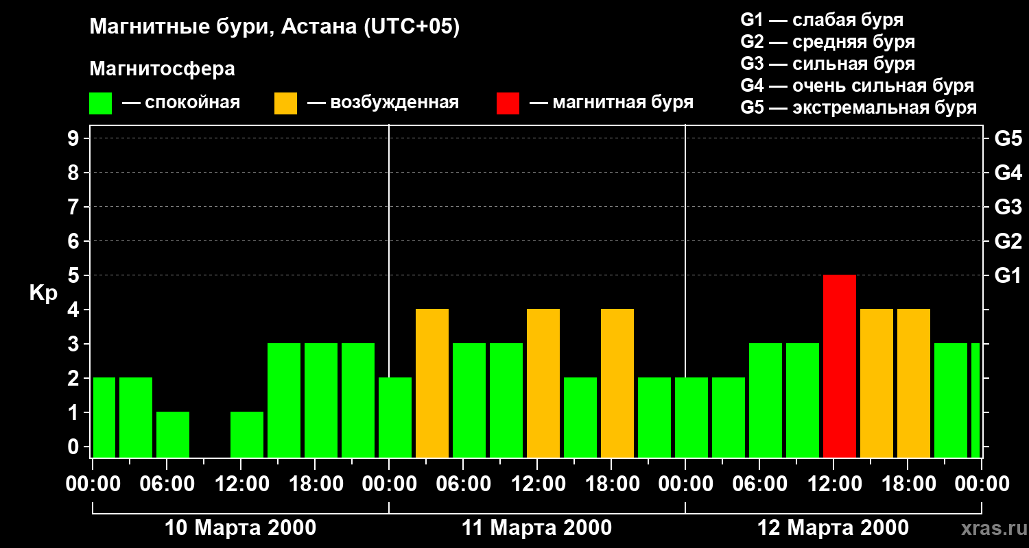 Изменения геомагнитного индекса Kp с 10 по 12 марта 2000 года для средних широт