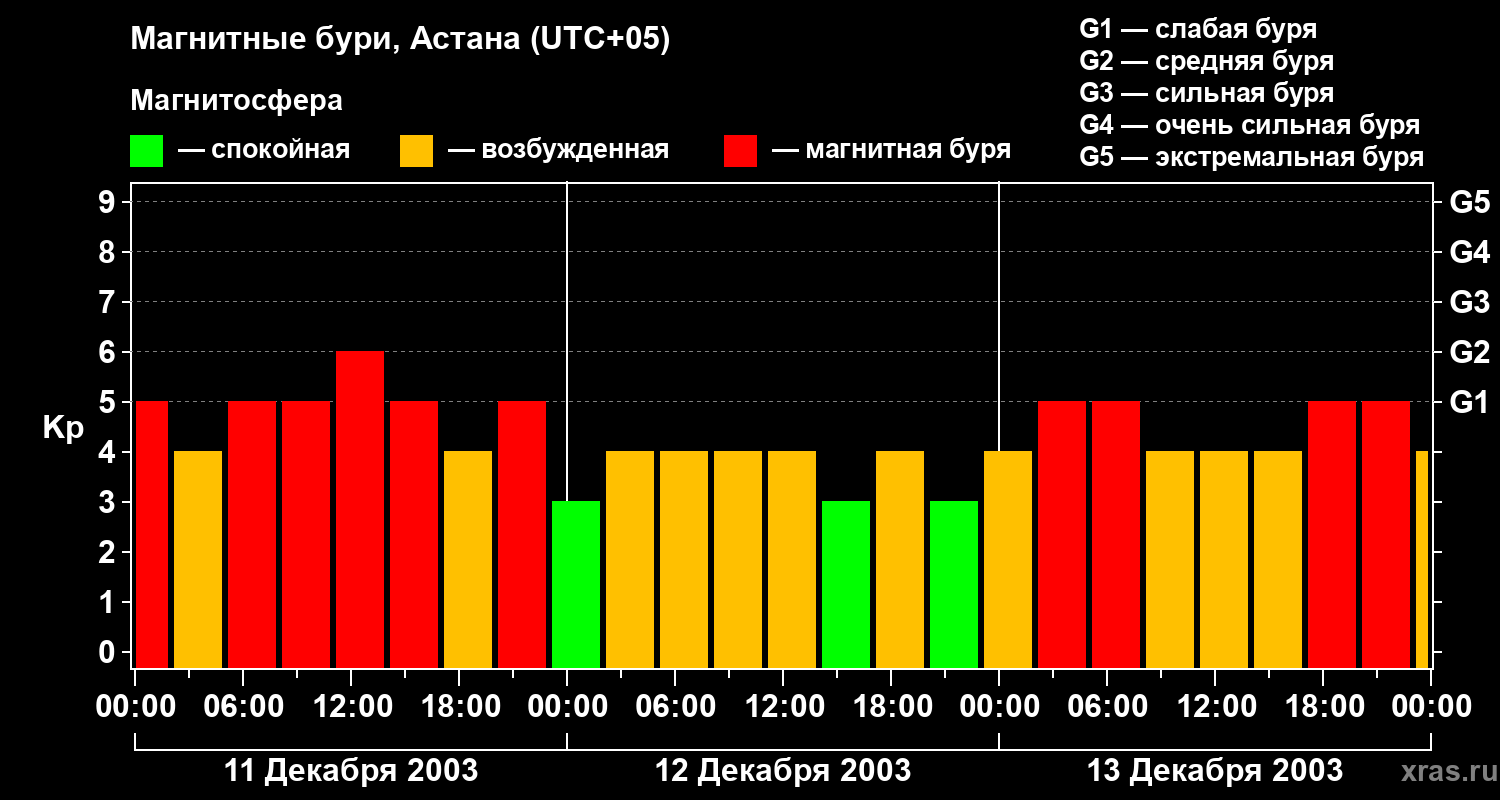 Изменения геомагнитного индекса Kp с 11 по 13 декабря 2003 года для средних широт