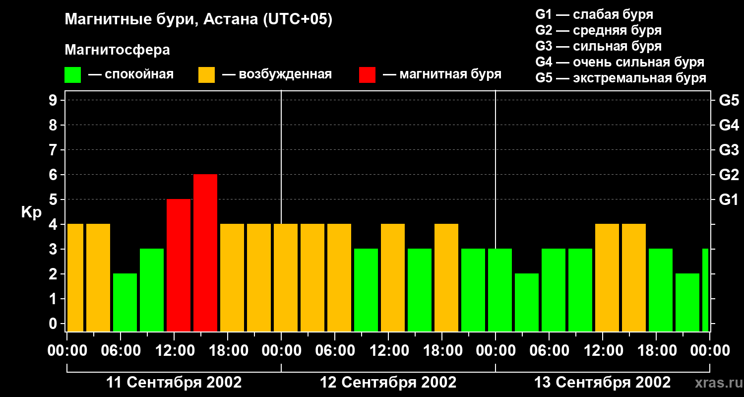 Изменения геомагнитного индекса Kp с 11 по 13 сентября 2002 года для средних широт
