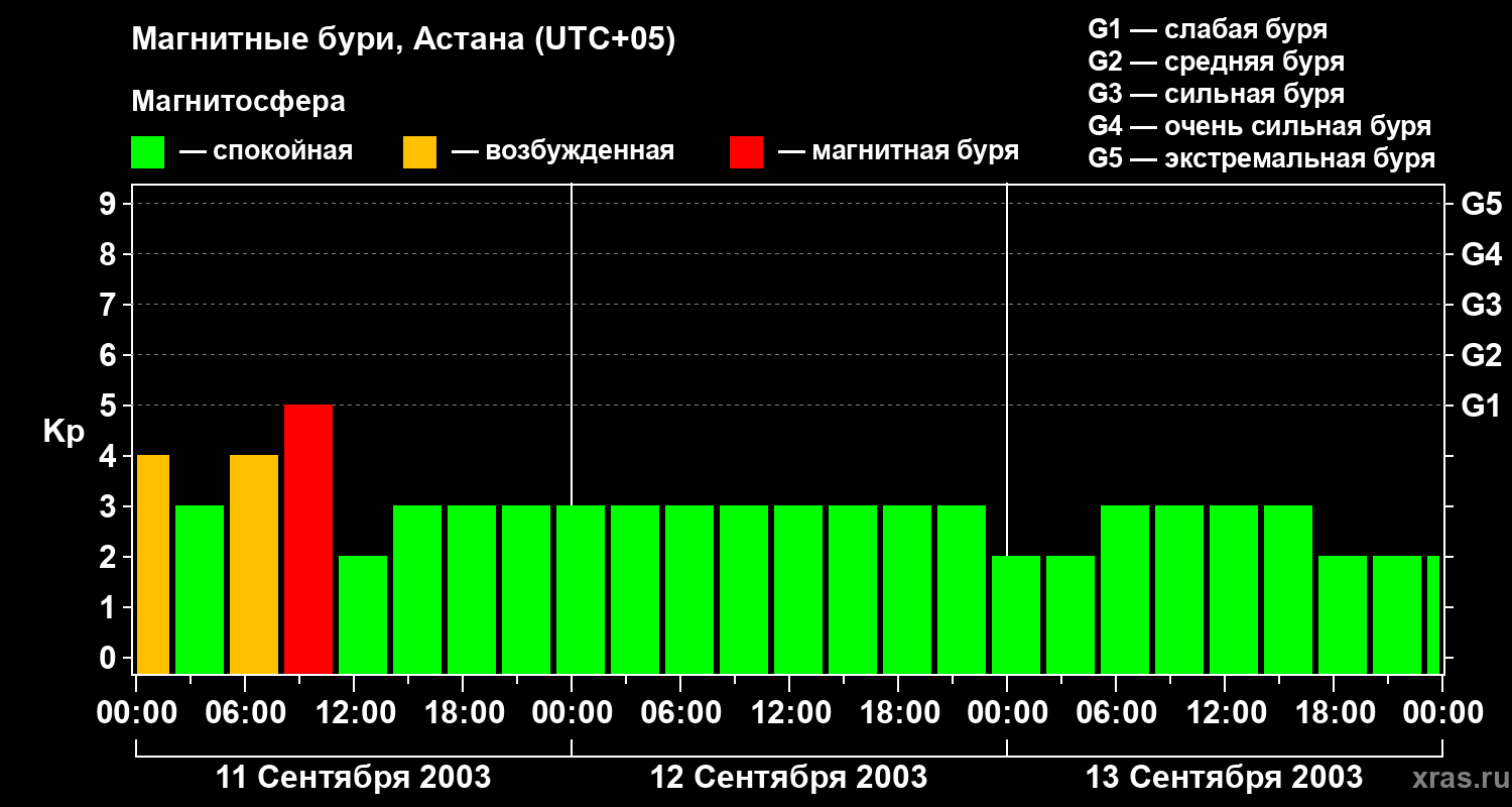Изменения геомагнитного индекса Kp с 11 по 13 сентября 2003 года для средних широт