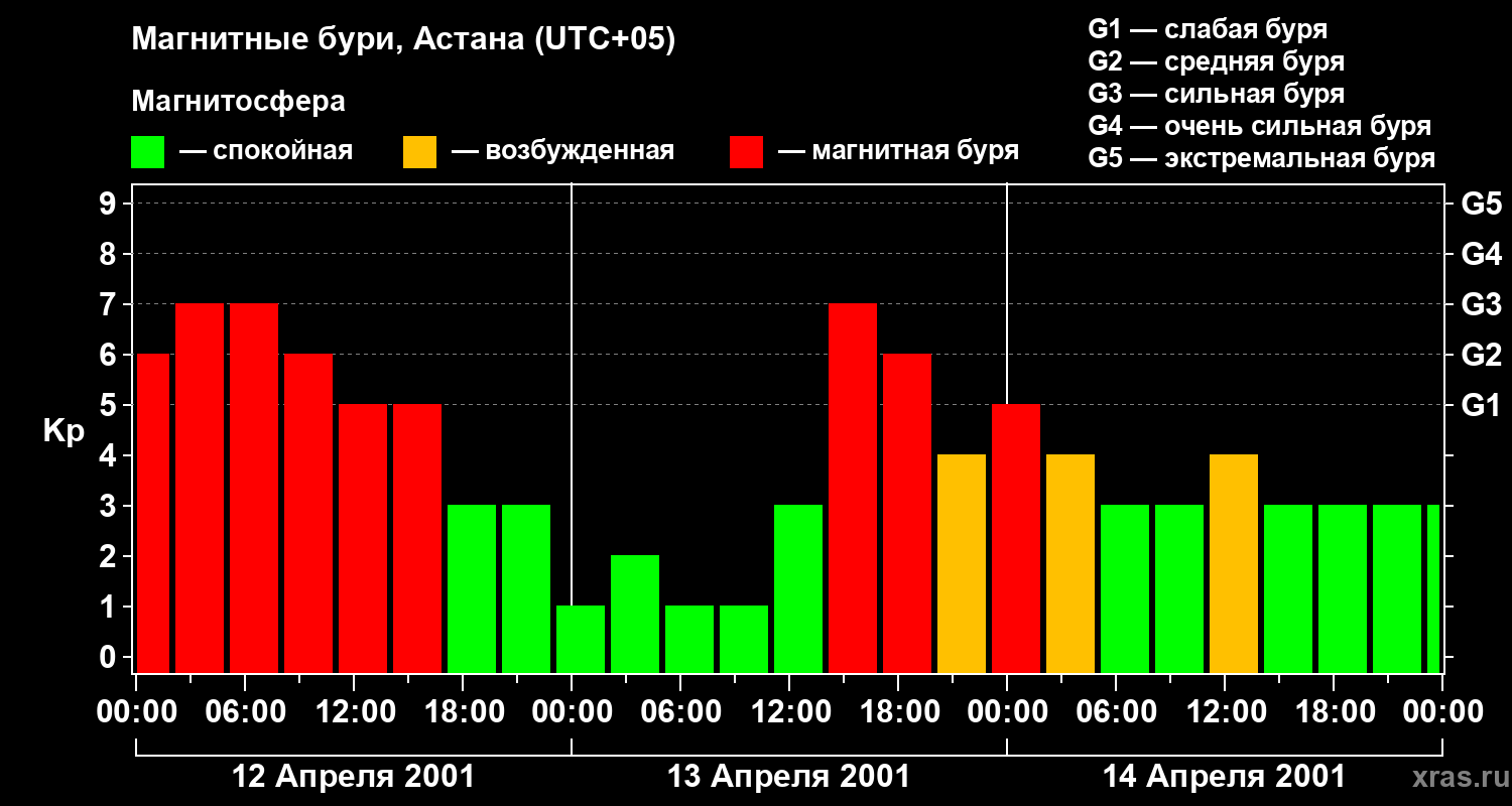 Изменения геомагнитного индекса Kp с 12 по 14 апреля 2001 года для средних широт