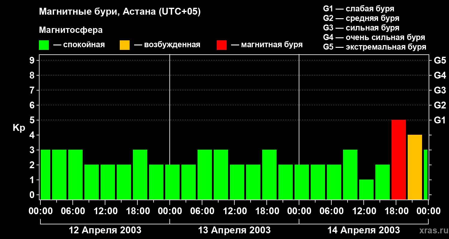 Изменения геомагнитного индекса Kp с 12 по 14 апреля 2003 года для средних широт