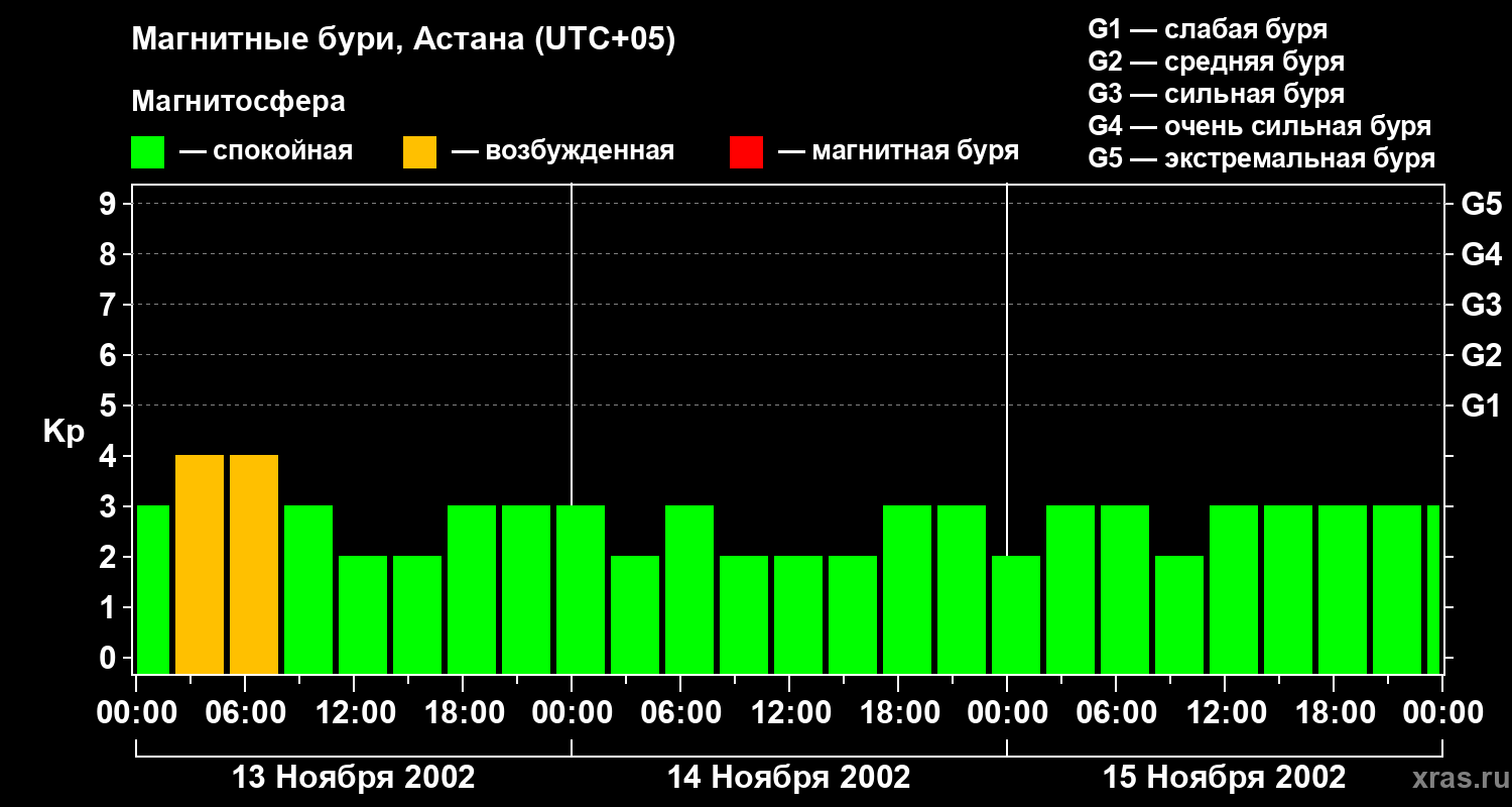 Изменения геомагнитного индекса Kp с 13 по 15 ноября 2002 года для средних широт