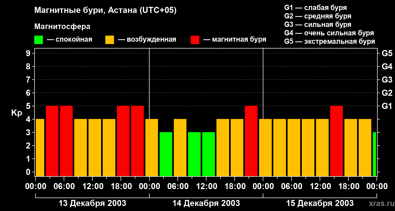 Изменения геомагнитного индекса Kp с 13 по 15 декабря 2003 года для средних широт