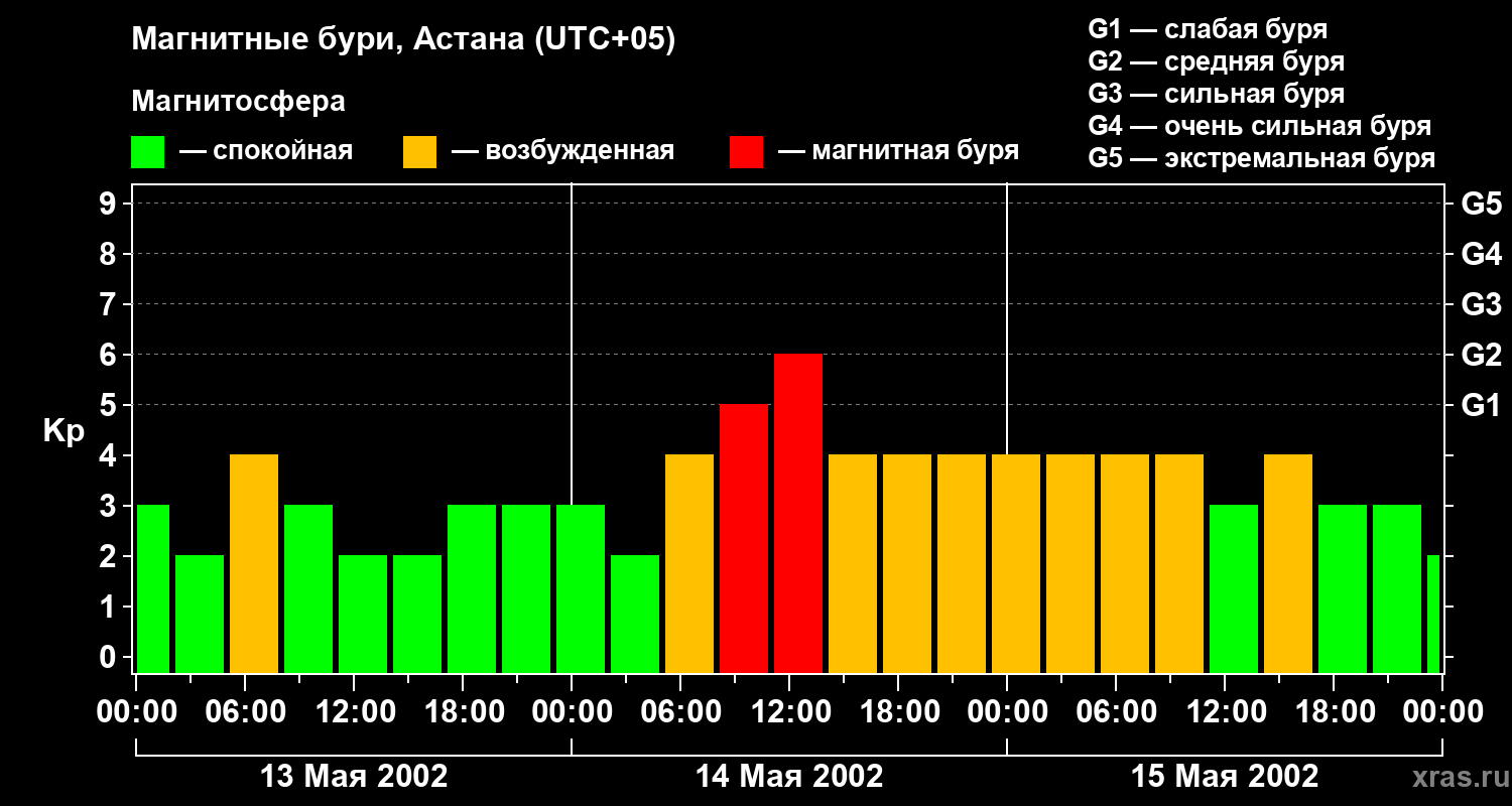 Изменения геомагнитного индекса Kp с 13 по 15 мая 2002 года для средних широт