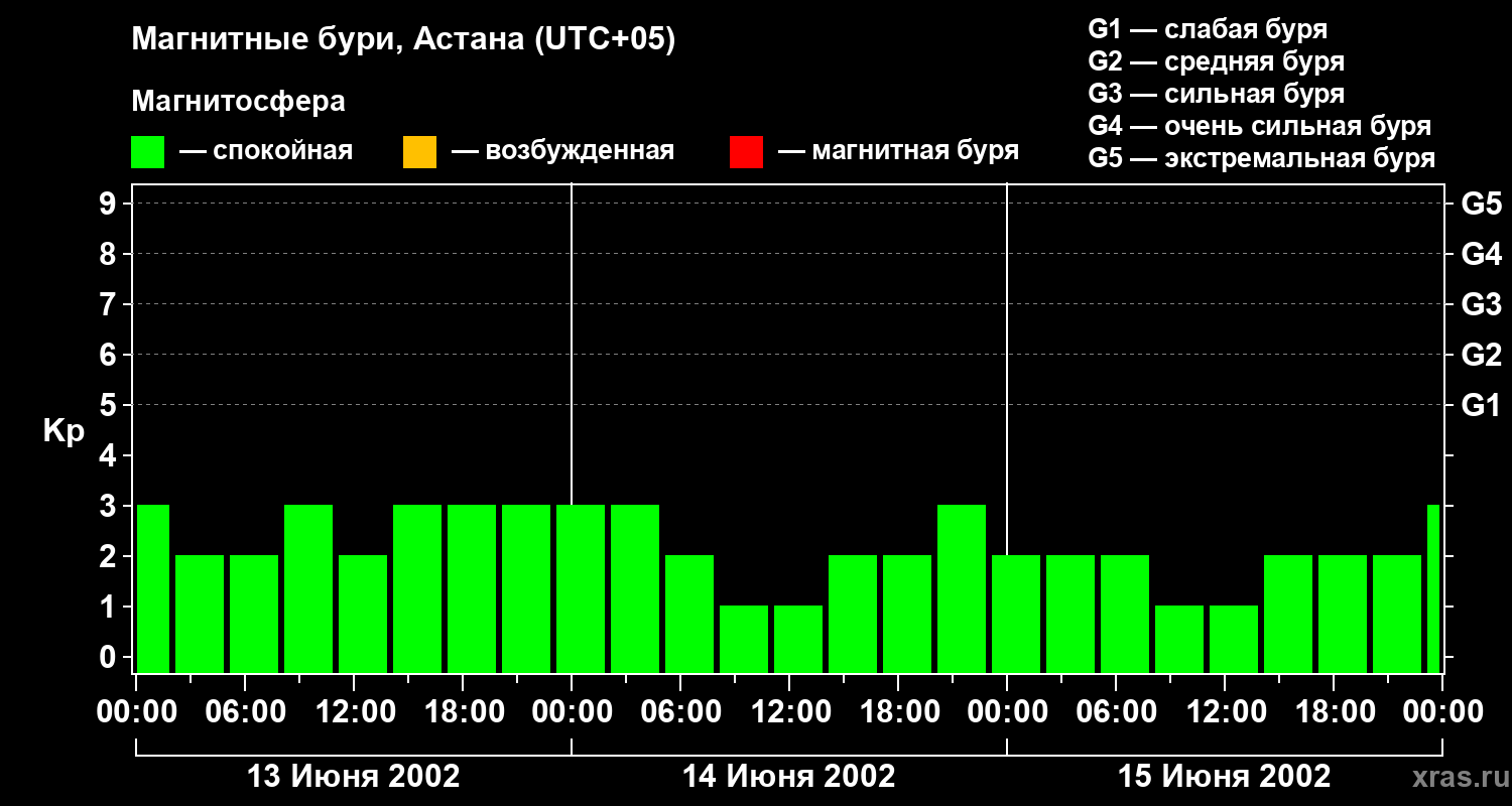 Изменения геомагнитного индекса Kp с 13 по 15 июня 2002 года для средних широт
