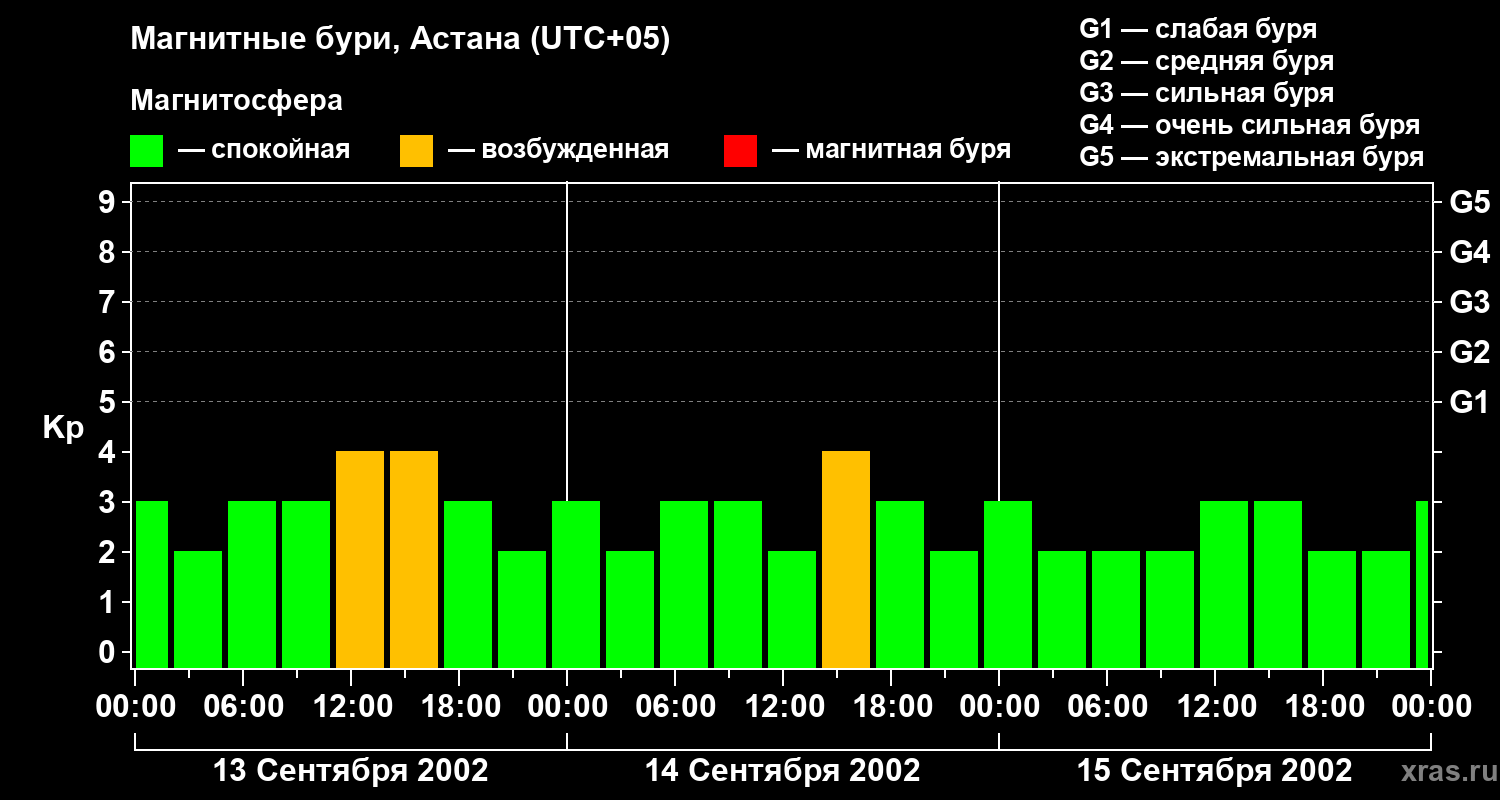 Изменения геомагнитного индекса Kp с 13 по 15 сентября 2002 года для средних широт