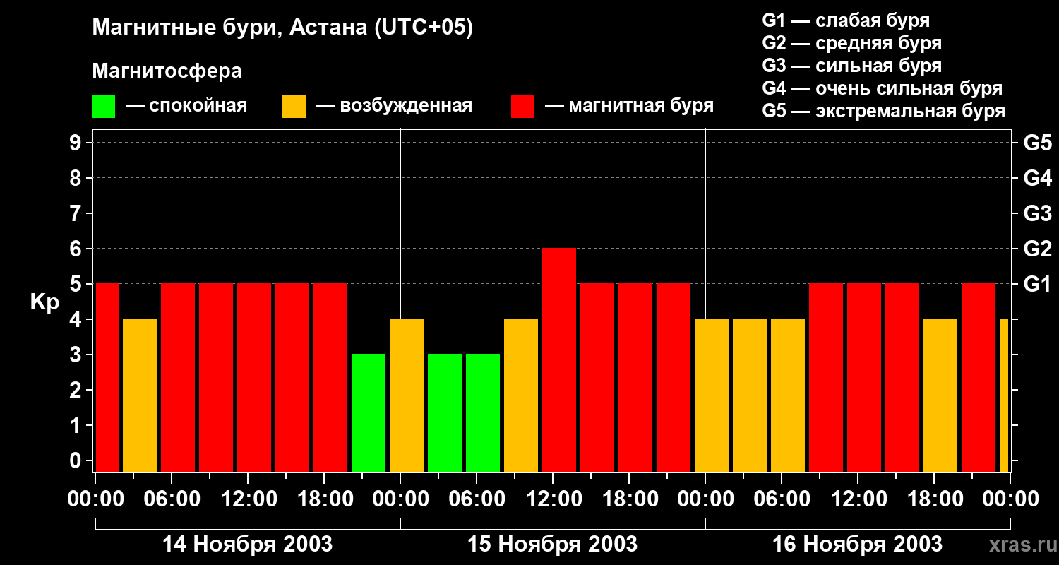 Изменения геомагнитного индекса Kp с 14 по 16 ноября 2003 года для средних широт