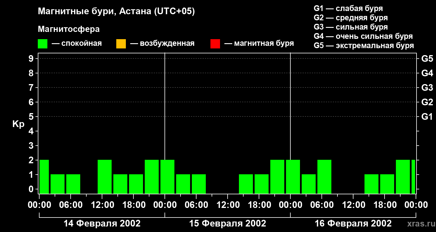 Изменения геомагнитного индекса Kp с 14 по 16 февраля 2002 года для средних широт
