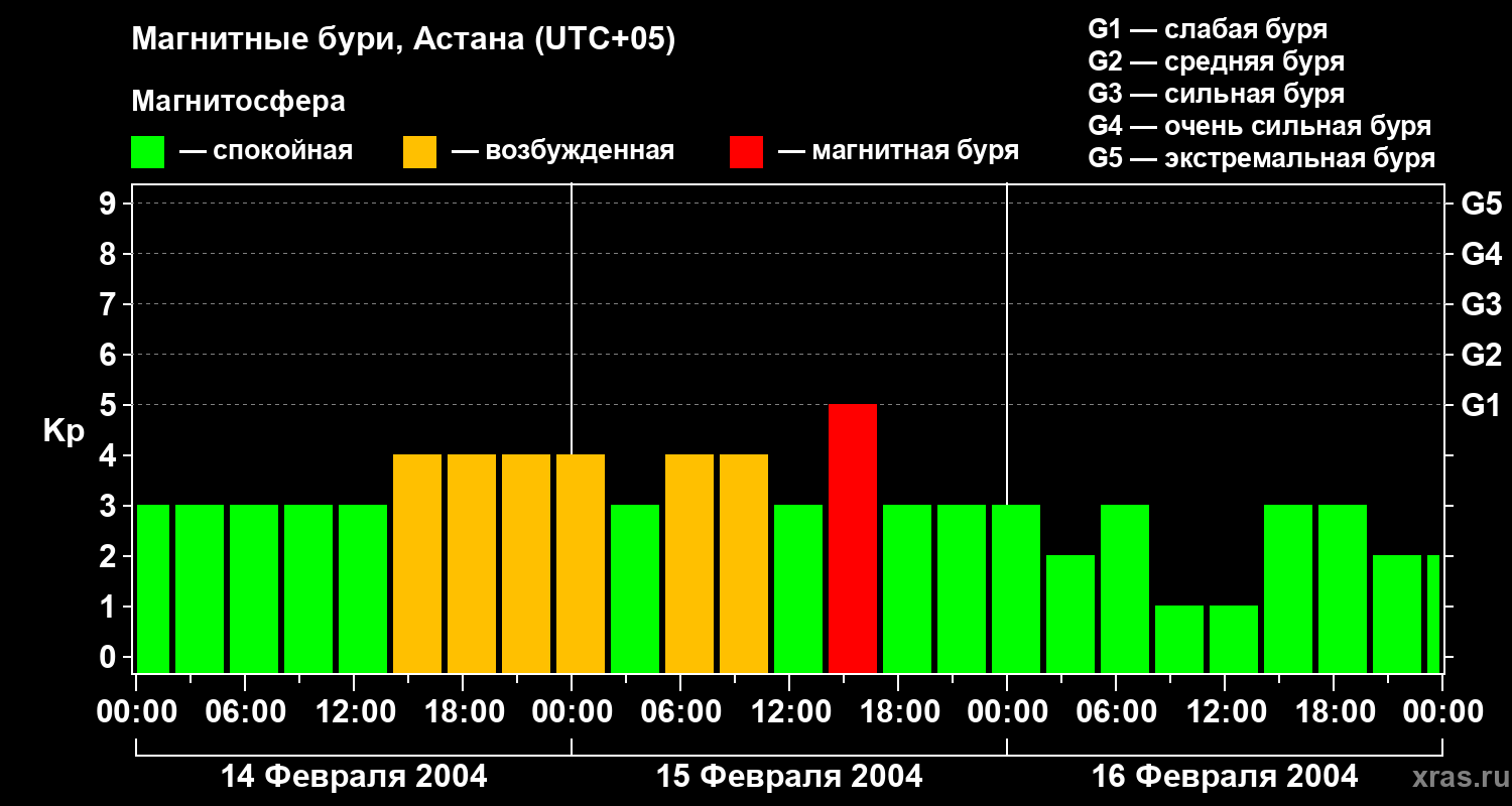 Изменения геомагнитного индекса Kp с 14 по 16 февраля 2004 года для средних широт