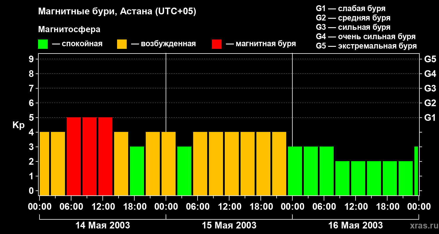 Изменения геомагнитного индекса Kp с 14 по 16 мая 2003 года для средних широт