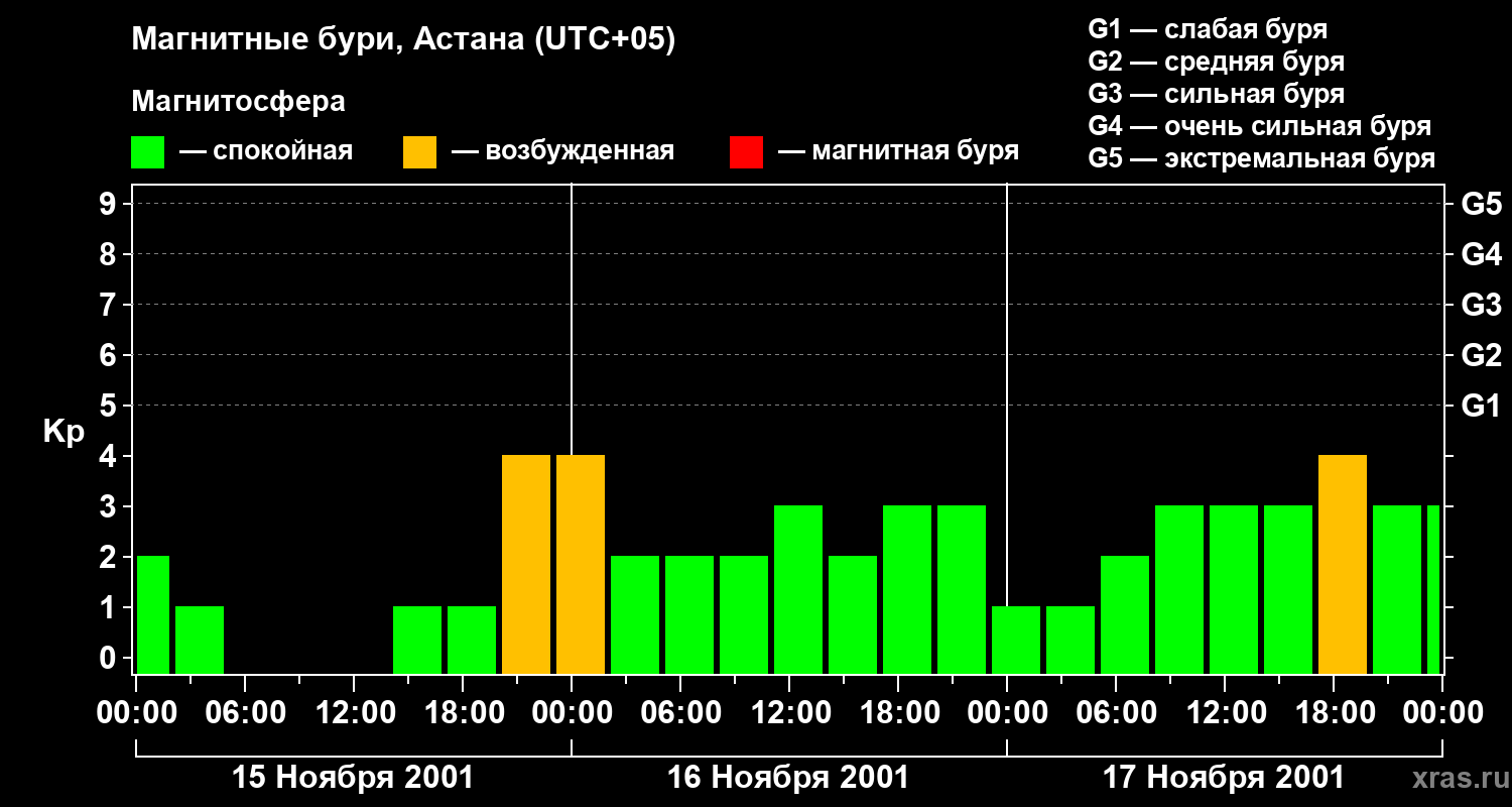 Изменения геомагнитного индекса Kp с 15 по 17 ноября 2001 года для средних широт