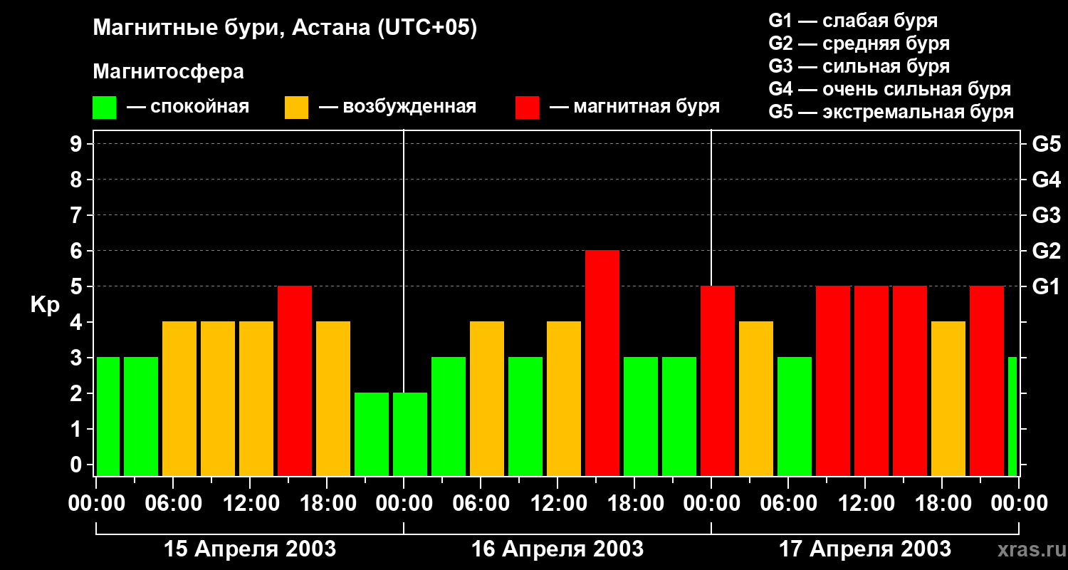 Изменения геомагнитного индекса Kp с 15 по 17 апреля 2003 года для средних широт