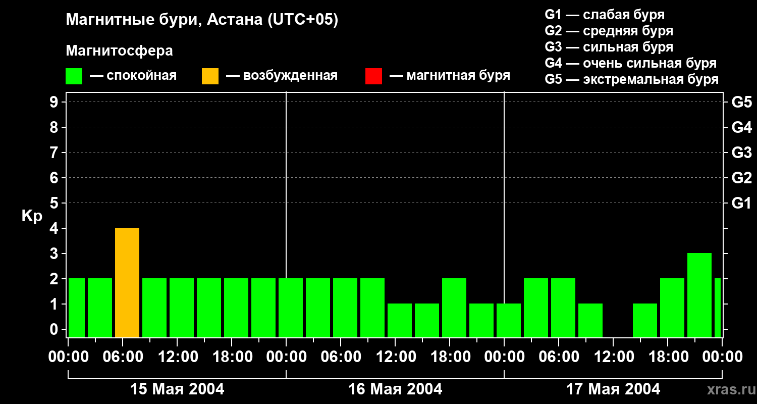 Изменения геомагнитного индекса Kp с 15 по 17 мая 2004 года для средних широт