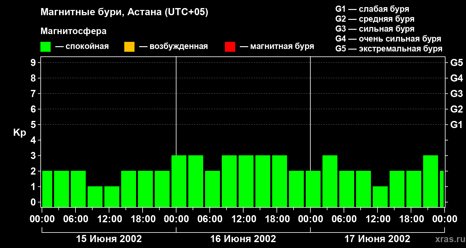 Изменения геомагнитного индекса Kp с 15 по 17 июня 2002 года для средних широт