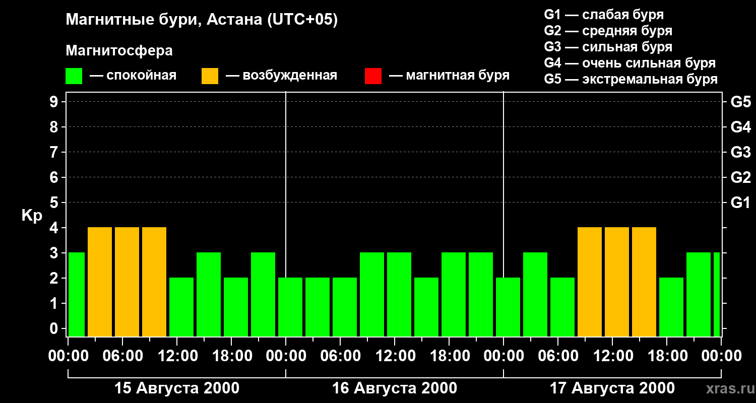 Изменения геомагнитного индекса Kp с 15 по 17 августа 2000 года для средних широт