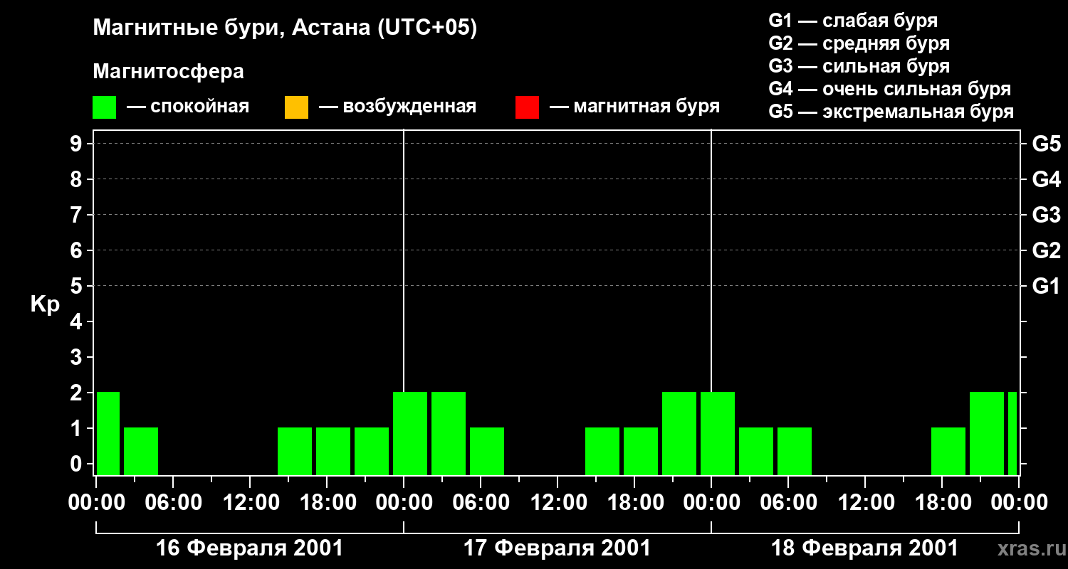 Изменения геомагнитного индекса Kp с 16 по 18 февраля 2001 года для средних широт