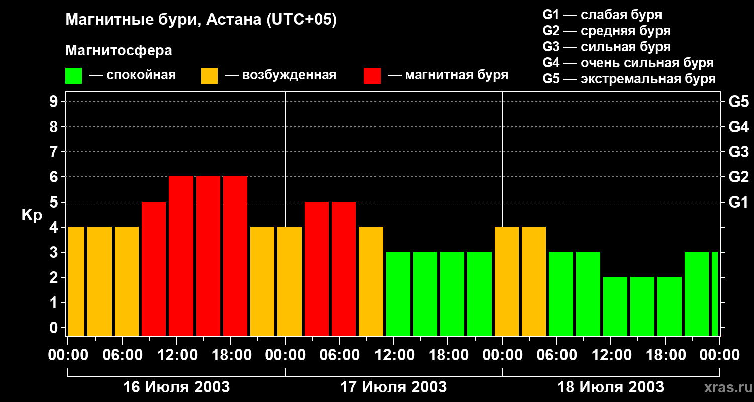 Изменения геомагнитного индекса Kp с 16 по 18 июля 2003 года для средних широт