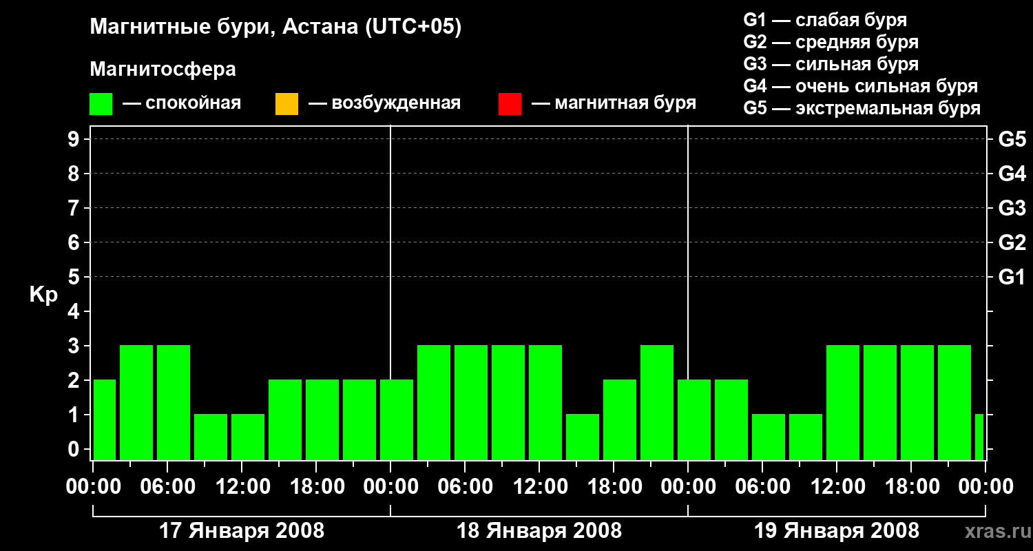 Изменения геомагнитного индекса Kp с 17 по 19 января 2008 года для средних широт