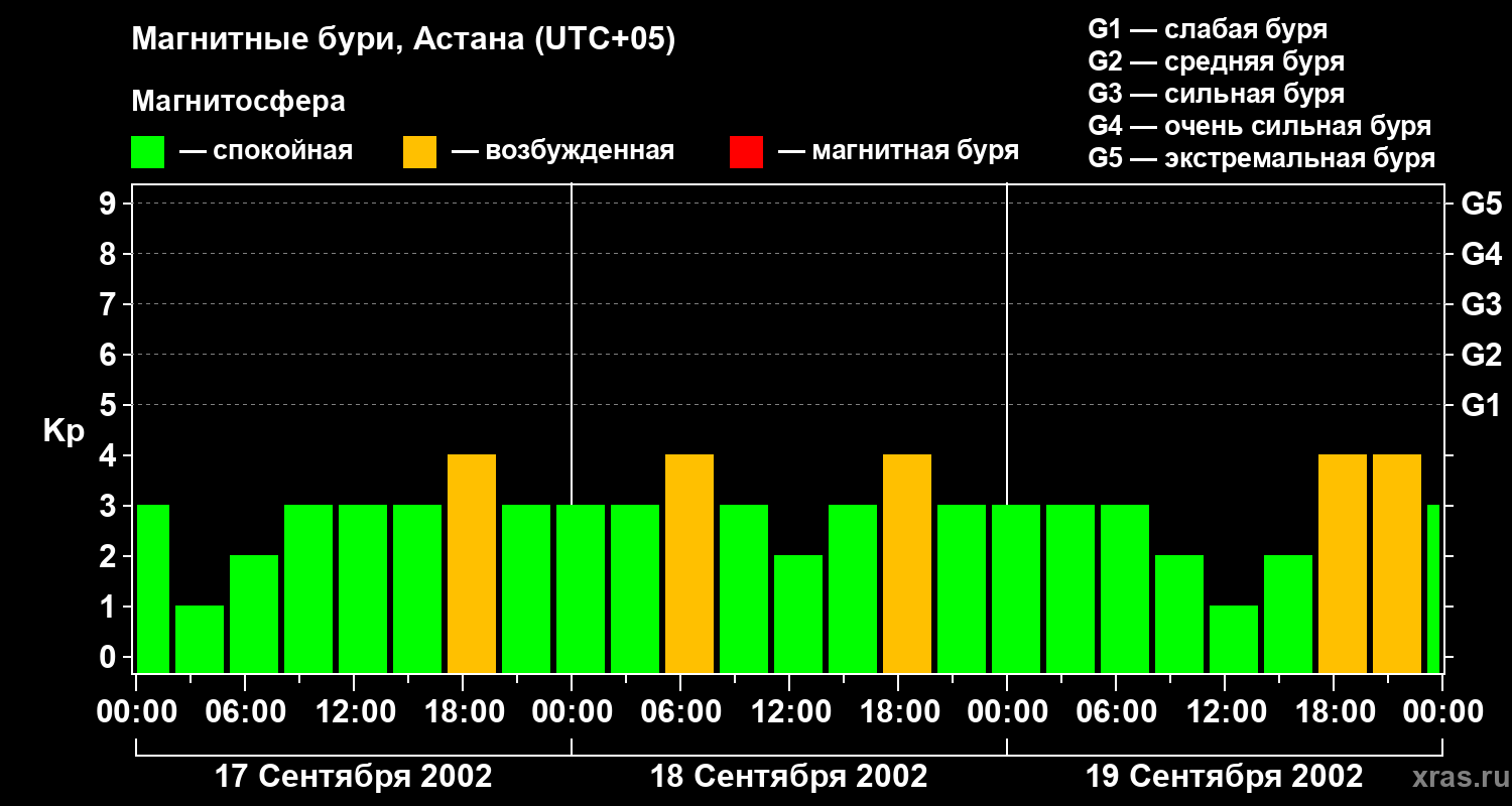 Изменения геомагнитного индекса Kp с 17 по 19 сентября 2002 года для средних широт