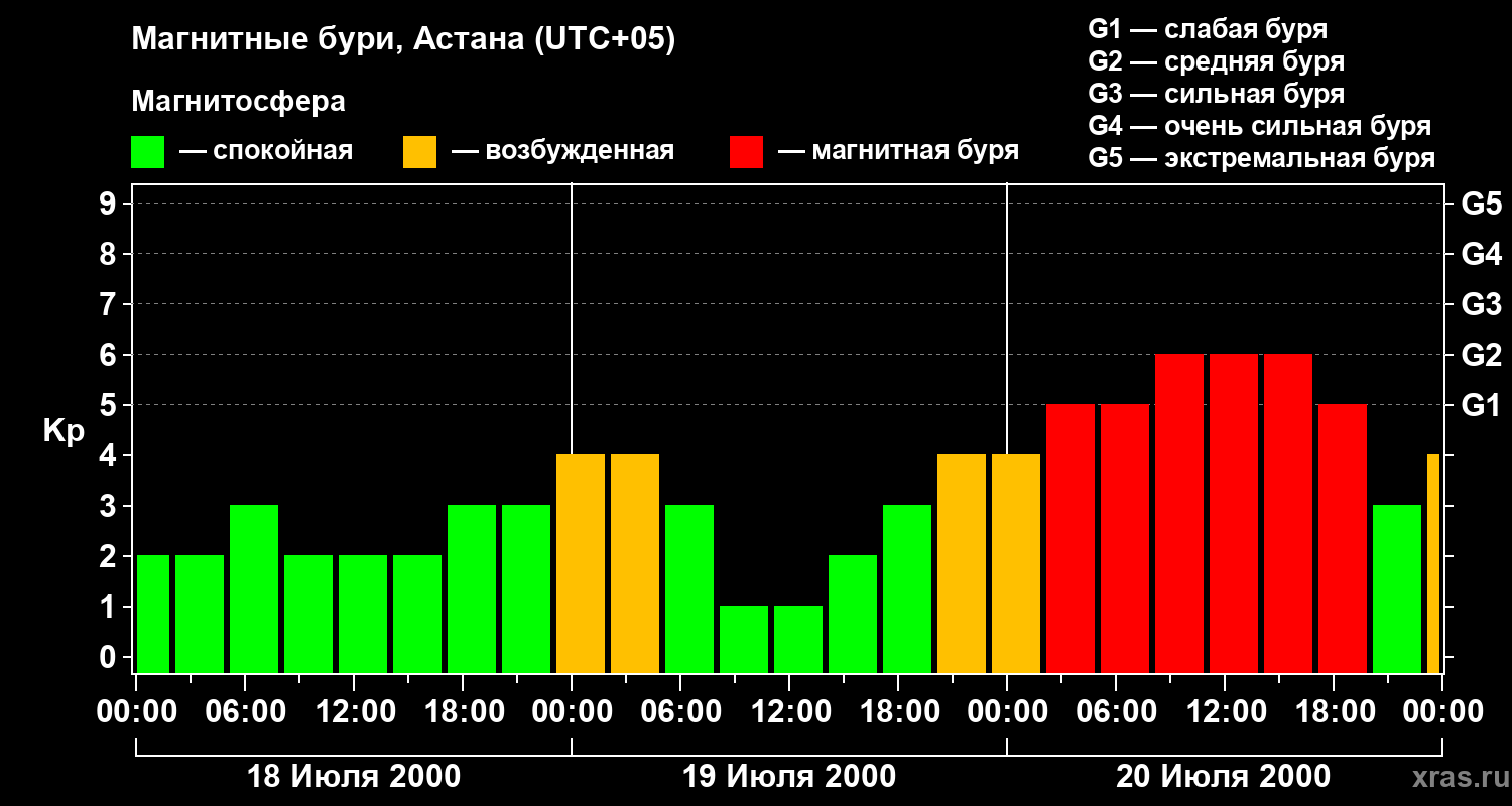 Изменения геомагнитного индекса Kp с 18 по 20 июля 2000 года для средних широт