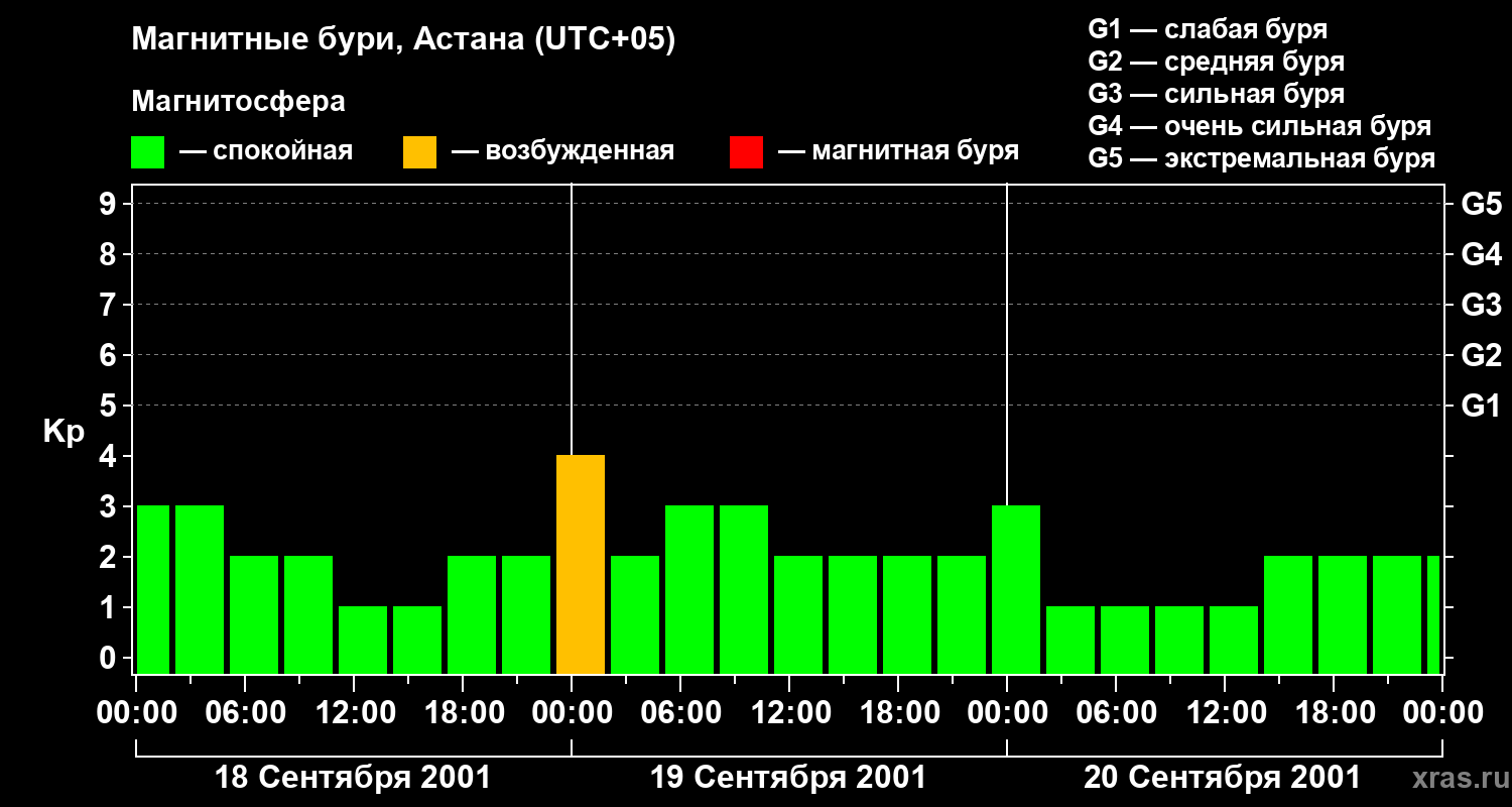 Изменения геомагнитного индекса Kp с 18 по 20 сентября 2001 года для средних широт