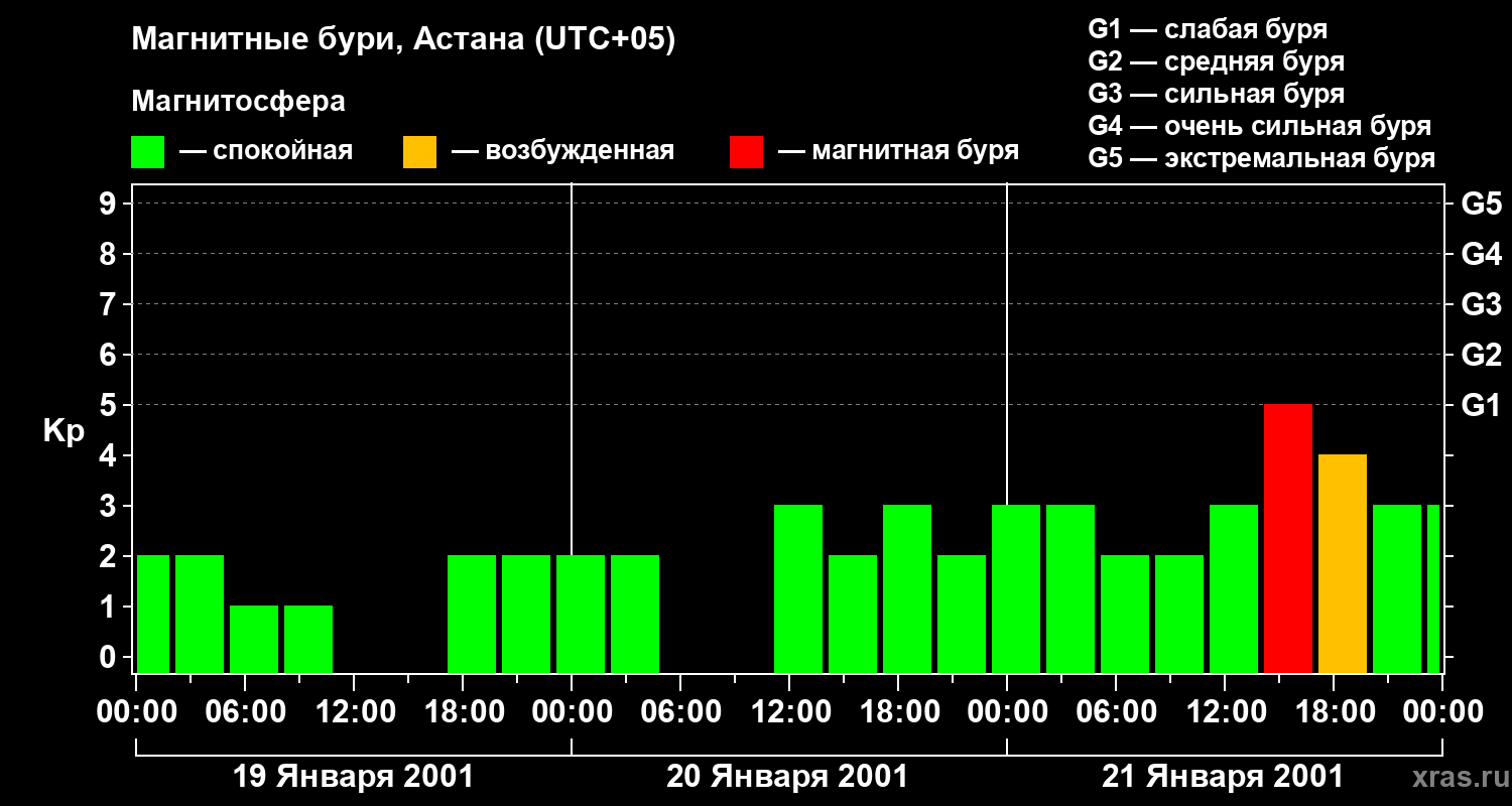 Изменения геомагнитного индекса Kp с 19 по 21 января 2001 года для средних широт