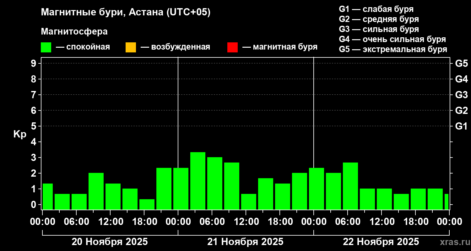 Изменения геомагнитного индекса Kp с 20 по 22 ноября 2025 года для средних широт