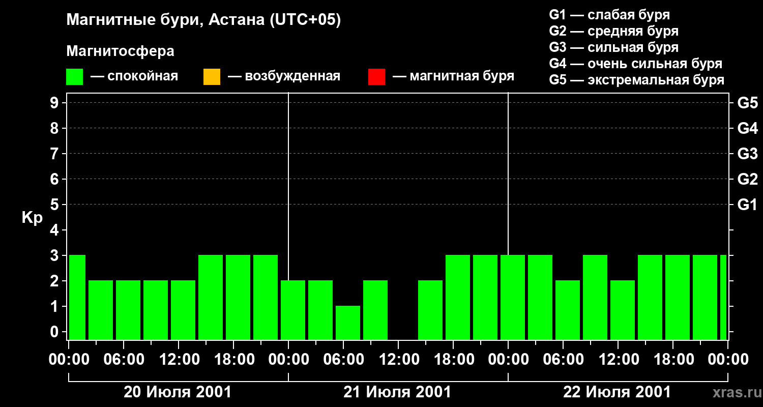 Изменения геомагнитного индекса Kp с 20 по 22 июля 2001 года для средних широт