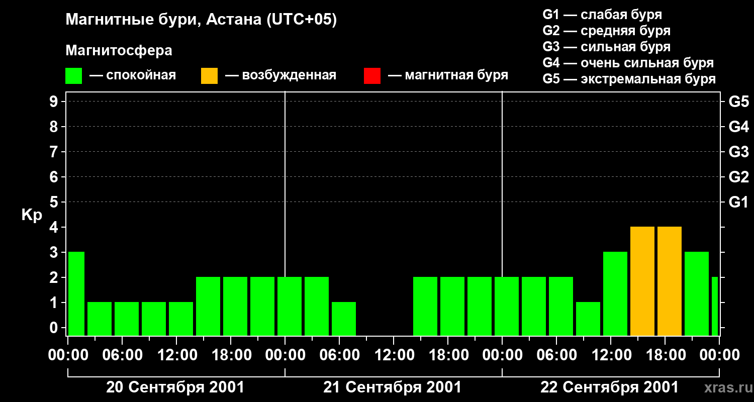 Изменения геомагнитного индекса Kp с 20 по 22 сентября 2001 года для средних широт