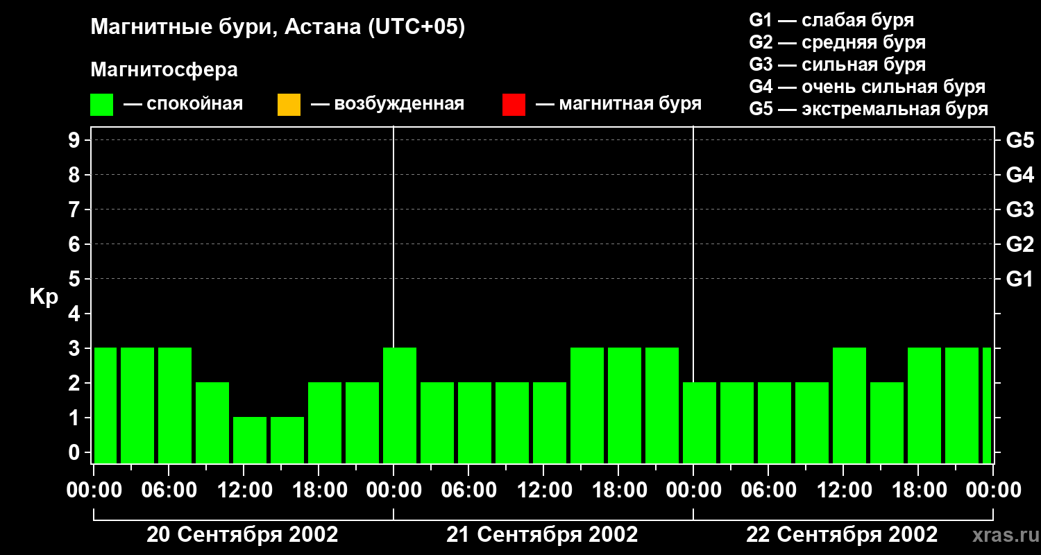Изменения геомагнитного индекса Kp с 20 по 22 сентября 2002 года для средних широт