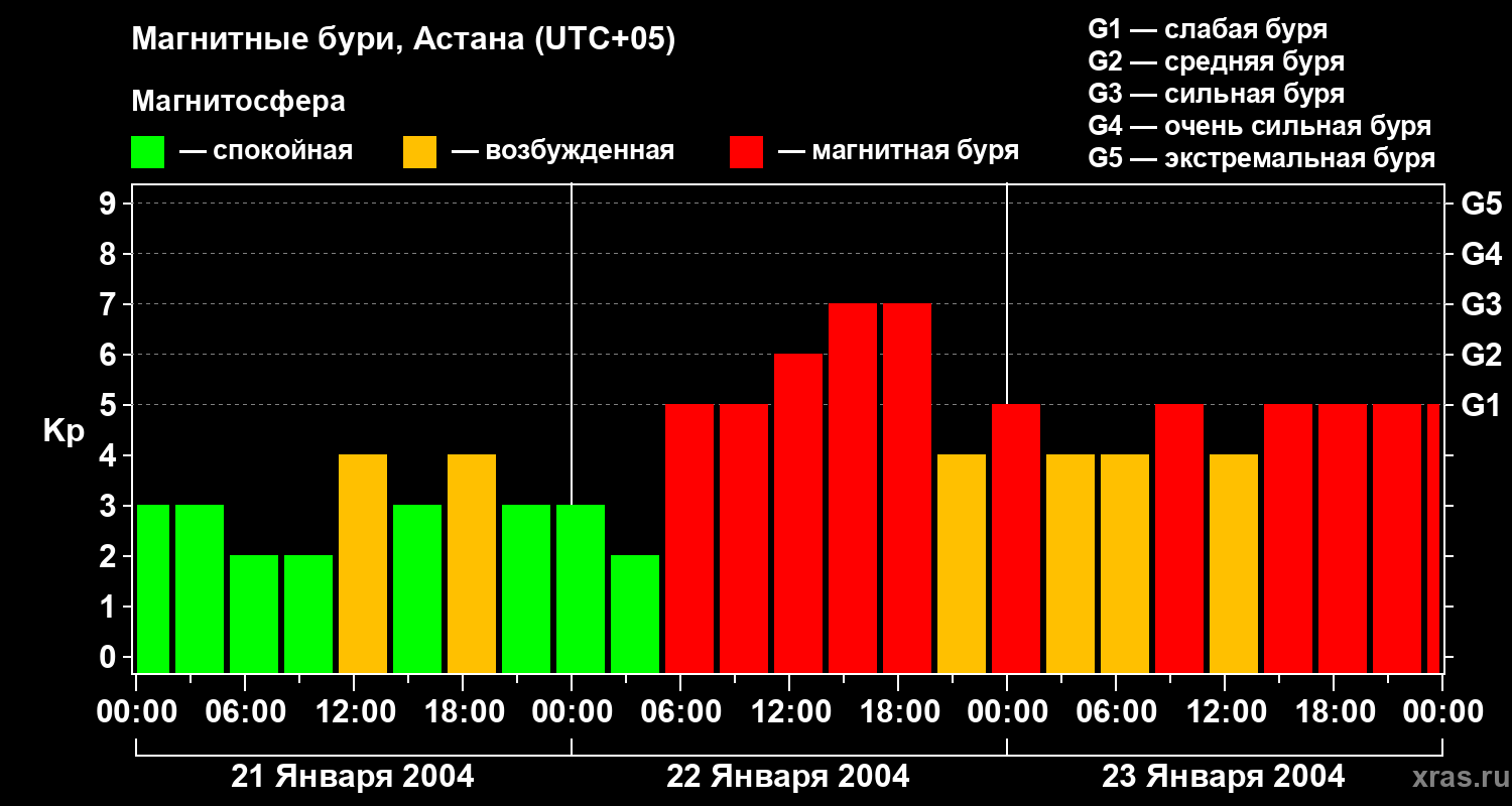 Изменения геомагнитного индекса Kp с 21 по 23 января 2004 года для средних широт