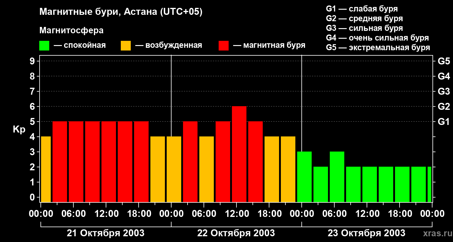 Изменения геомагнитного индекса Kp с 21 по 23 октября 2003 года для средних широт