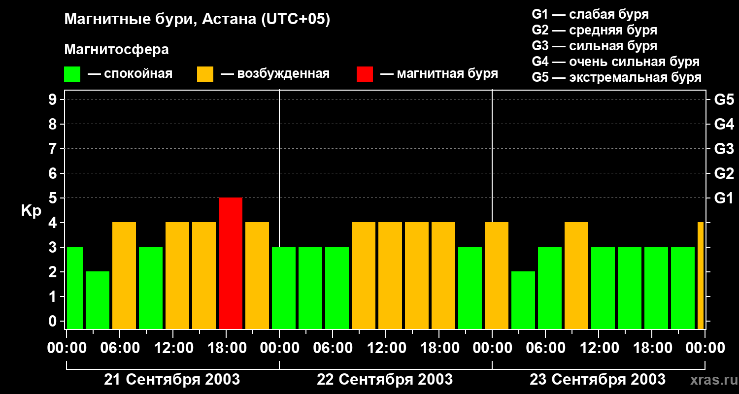 Изменения геомагнитного индекса Kp с 21 по 23 сентября 2003 года для средних широт