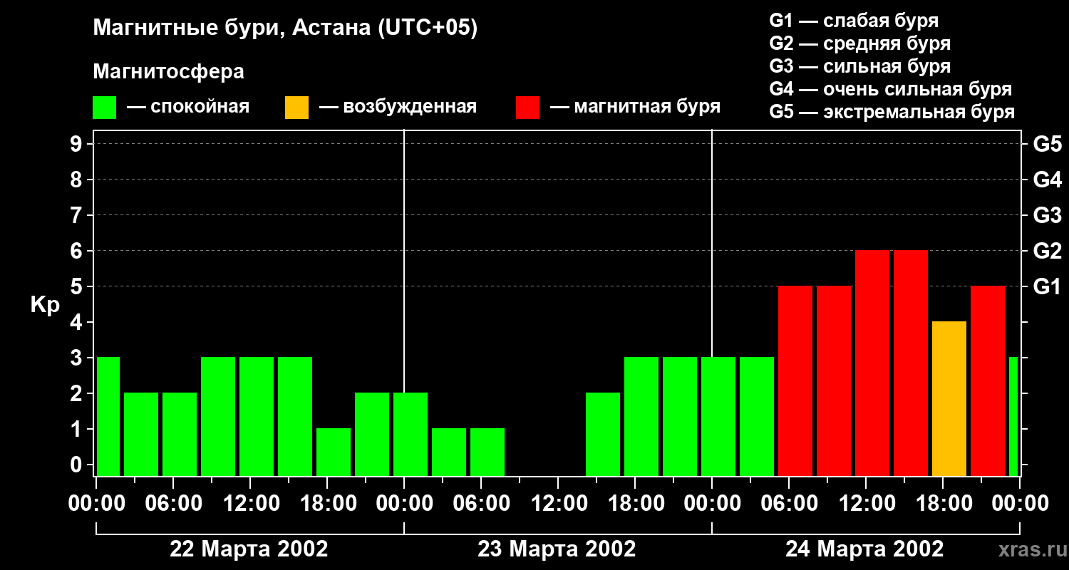 Изменения геомагнитного индекса Kp с 22 по 24 марта 2002 года для средних широт