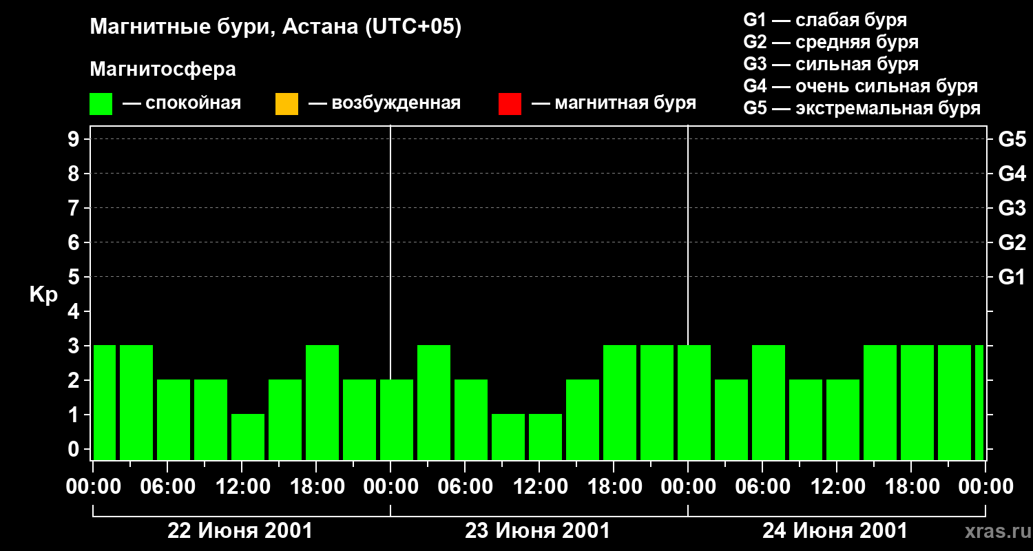 Изменения геомагнитного индекса Kp с 22 по 24 июня 2001 года для средних широт
