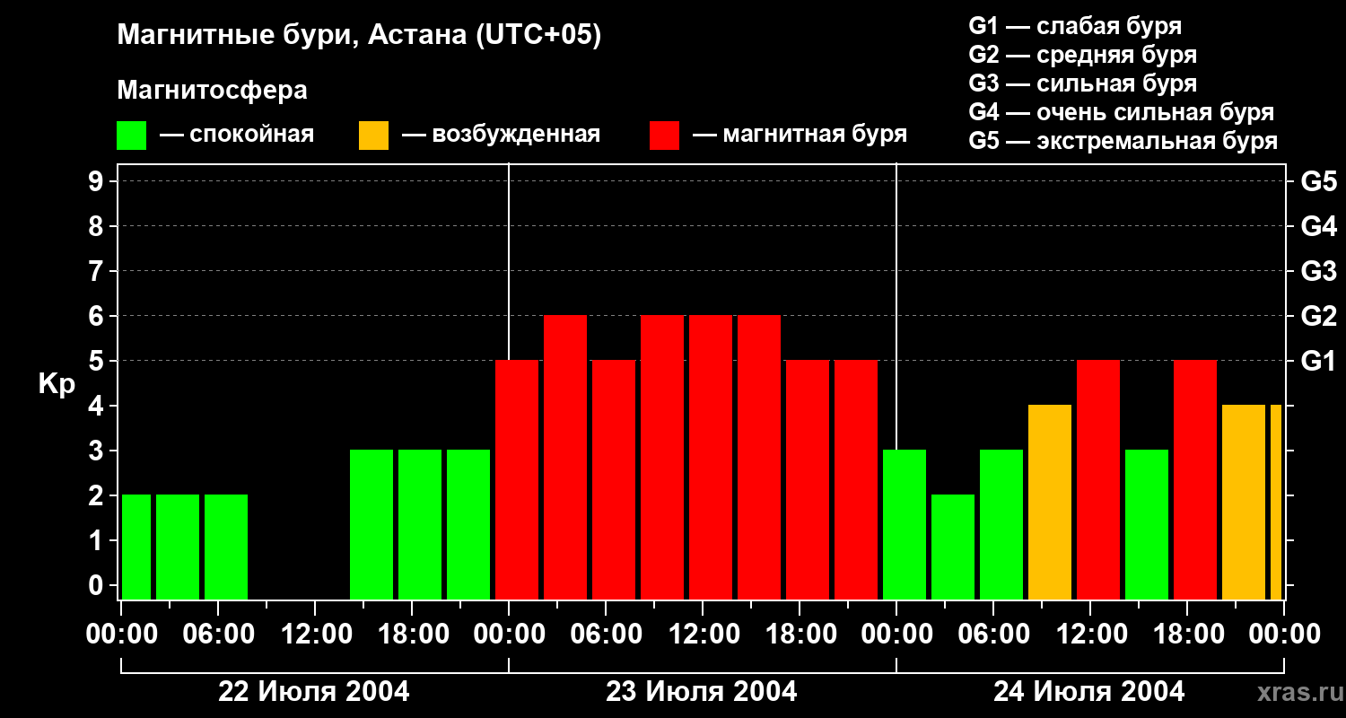 Изменения геомагнитного индекса Kp с 22 по 24 июля 2004 года для средних широт