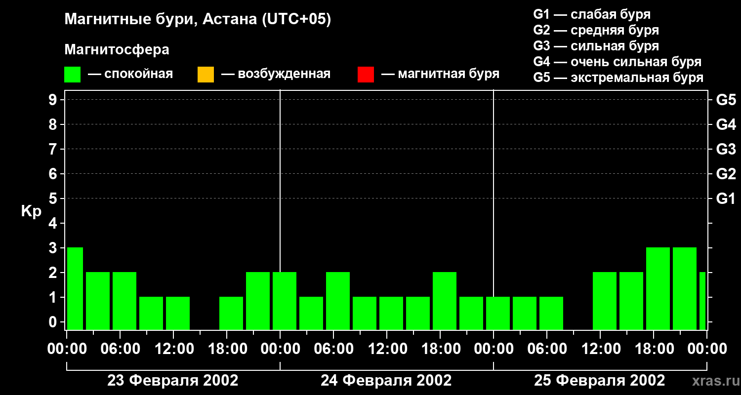 Изменения геомагнитного индекса Kp с 23 по 25 февраля 2002 года для средних широт