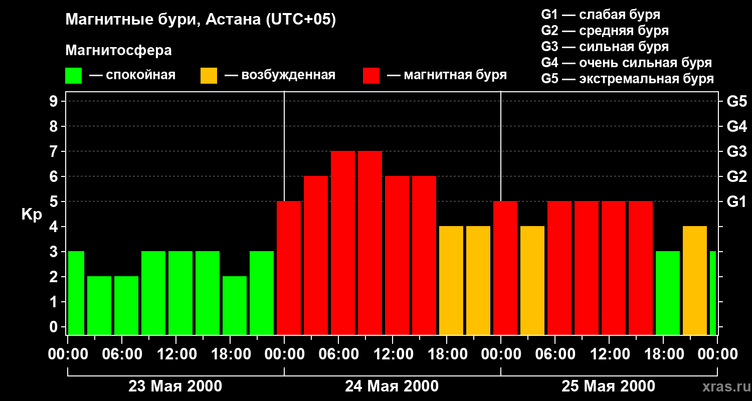 Изменения геомагнитного индекса Kp с 23 по 25 мая 2000 года для средних широт