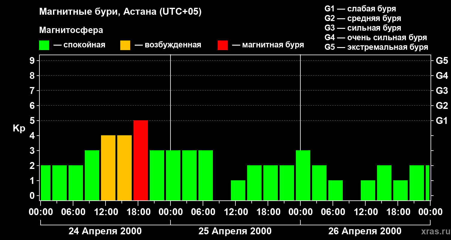 Изменения геомагнитного индекса Kp с 24 по 26 апреля 2000 года для средних широт