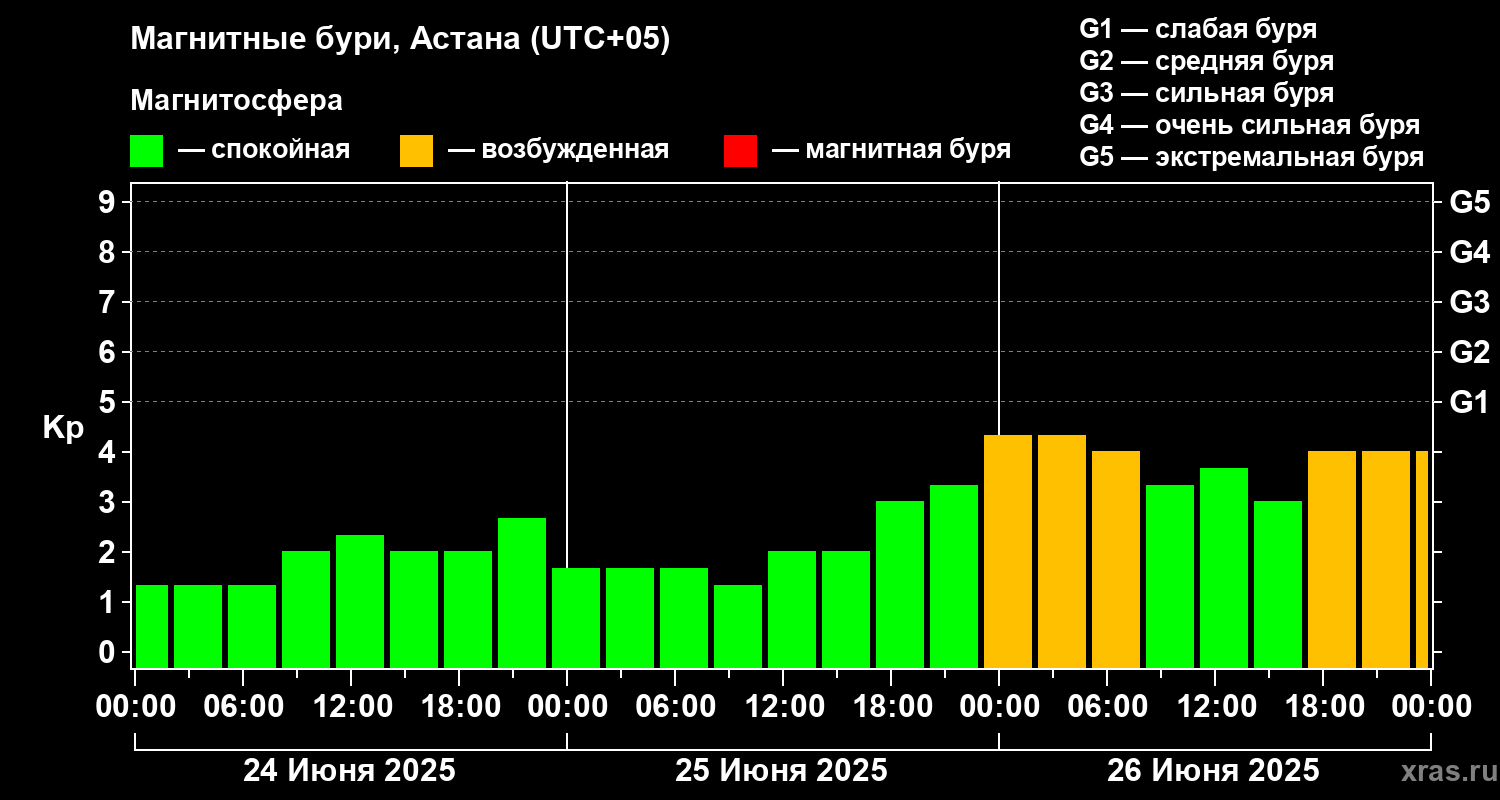 Изменения геомагнитного индекса Kp с 24 по 26 июня 2025 года для средних широт